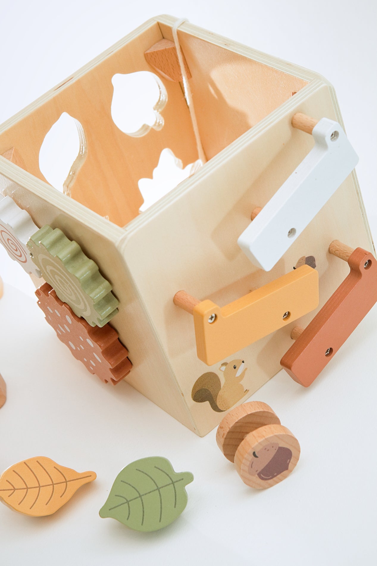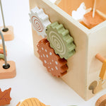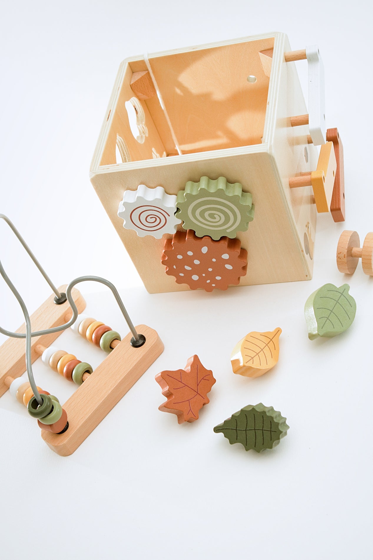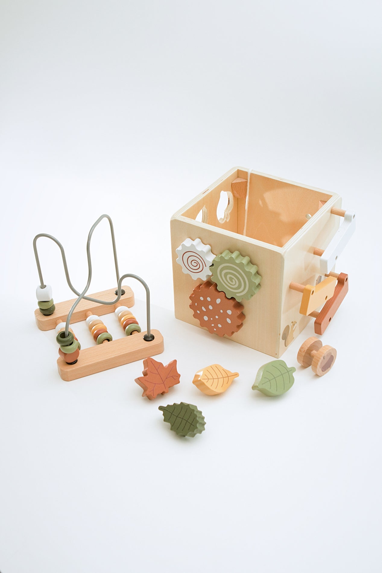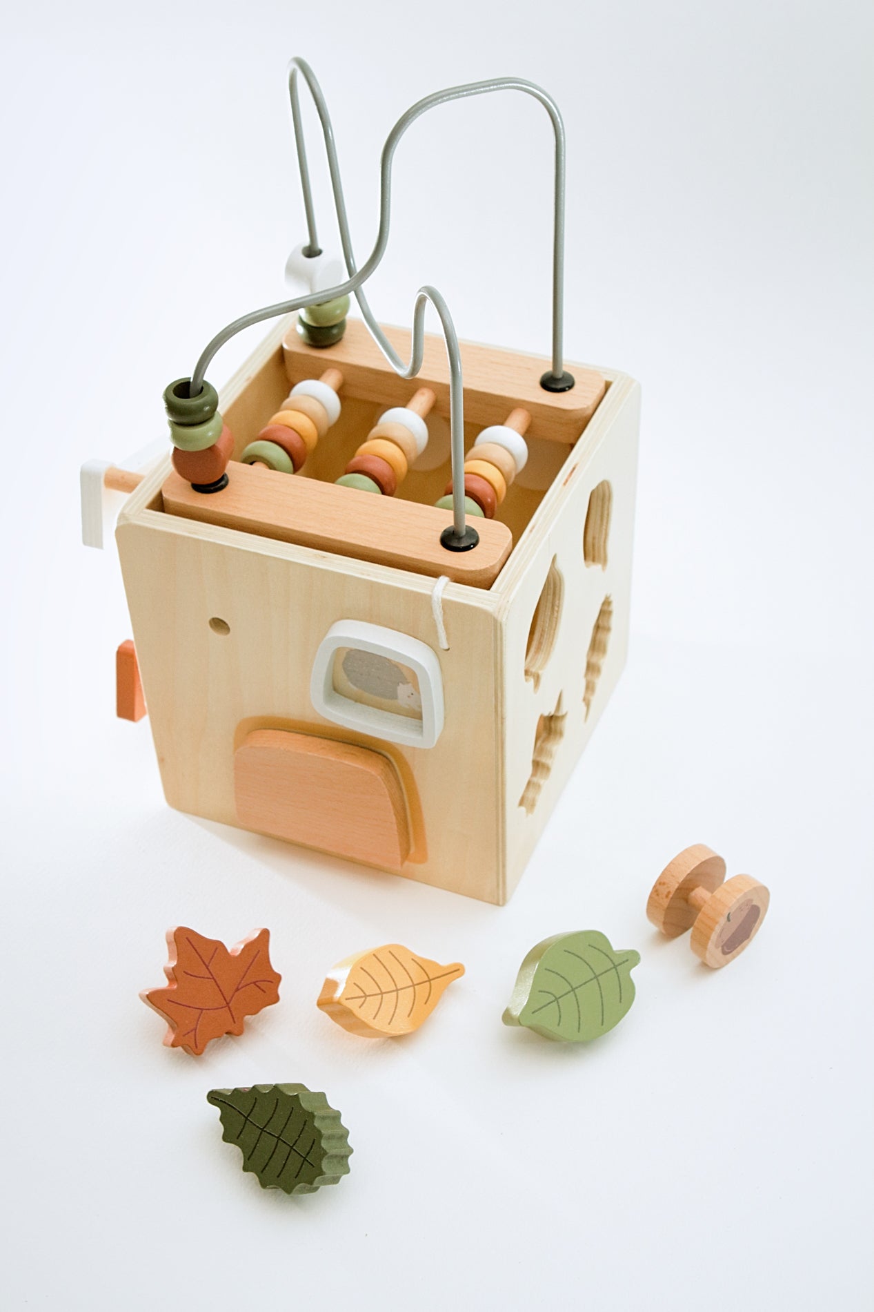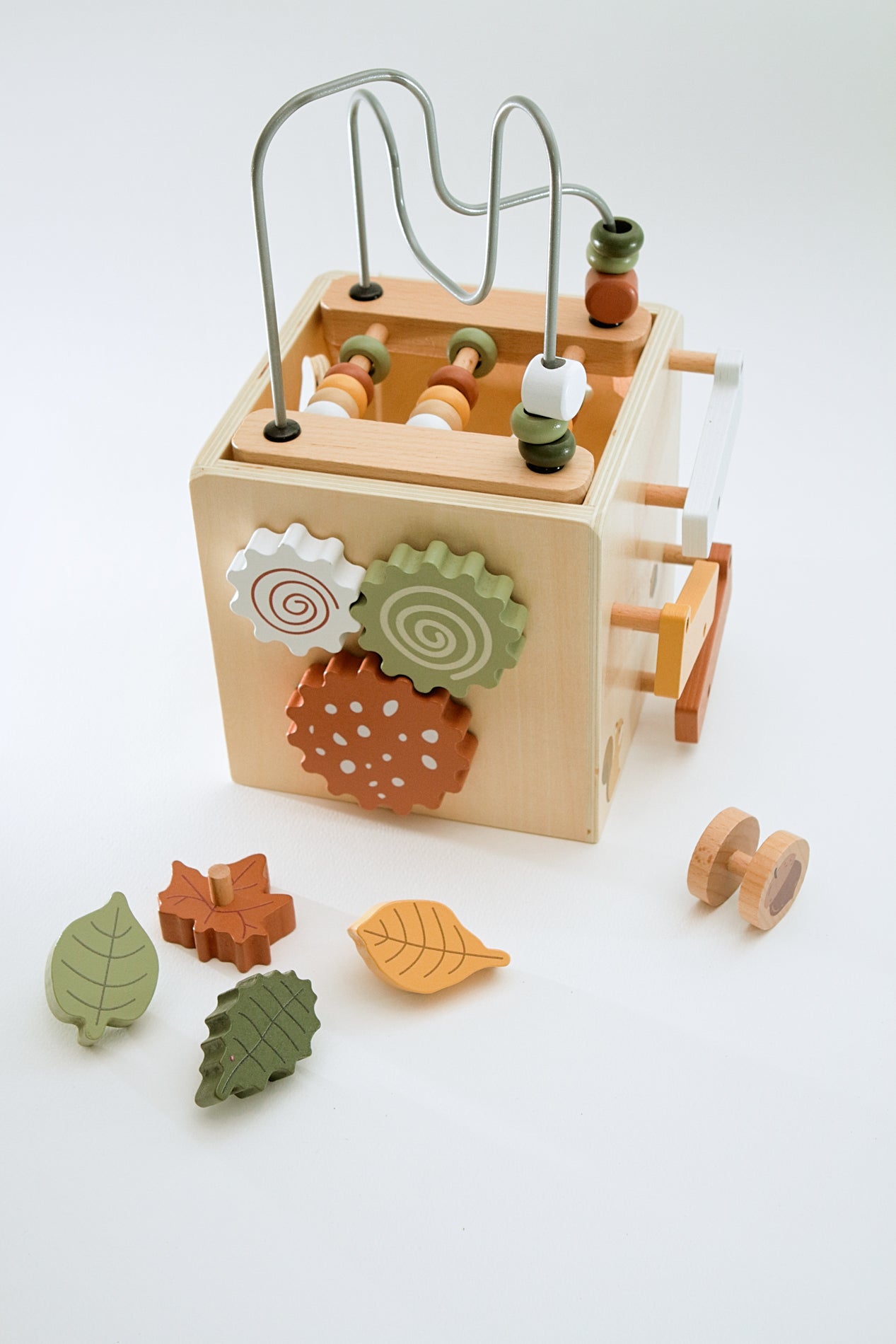 Αυτός ο ξύλινος κύβος, με τις πολλές πλευρές και τα διαφορετικά παιχνίδια, θα κρατήσει το μωρό σας απασχολημένο και χαρούμενο, ενώ παράλληλα θα το βοηθήσει να αναπτύξει τις κινητικές του δεξιότητες και τη φαντασία του. Περιστρεφόμενα γρανάζια, παζλ, κρυμμένα ζωάκια, διαδρομές και μια διασκεδαστική σπείρα με χάντρες στην κορυφή.