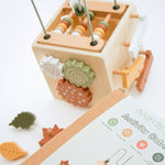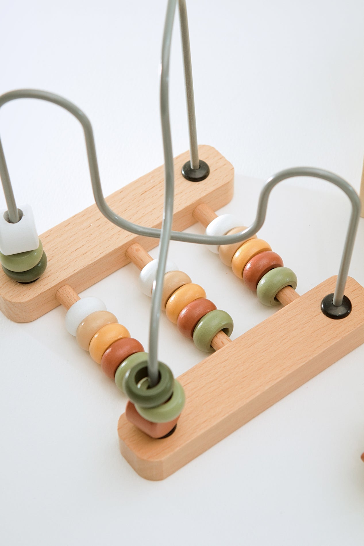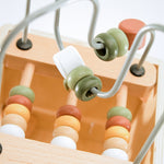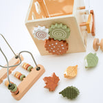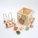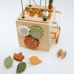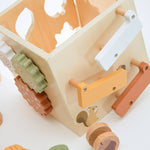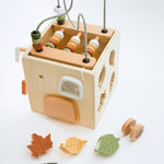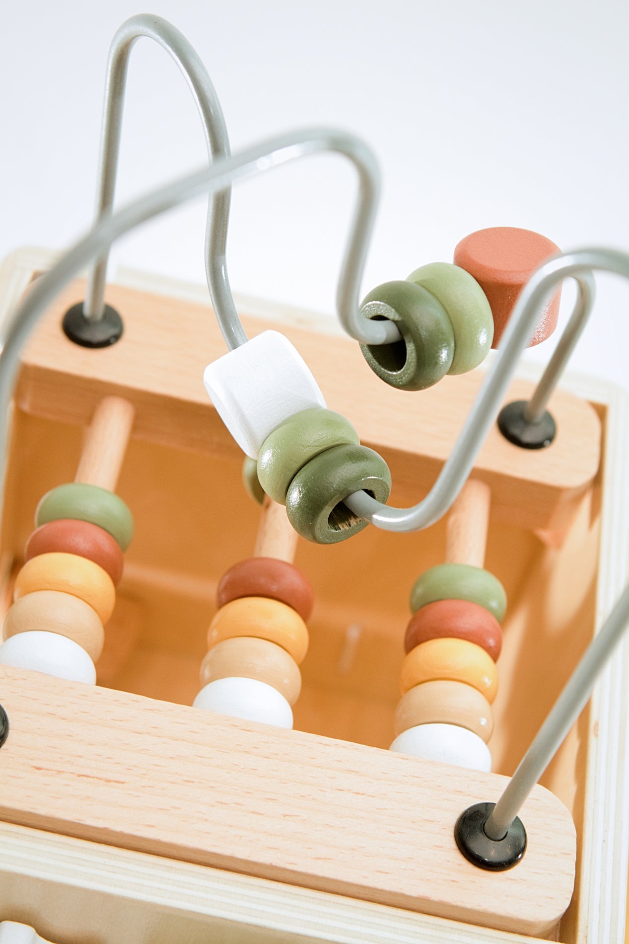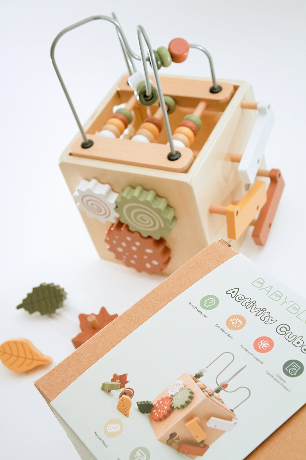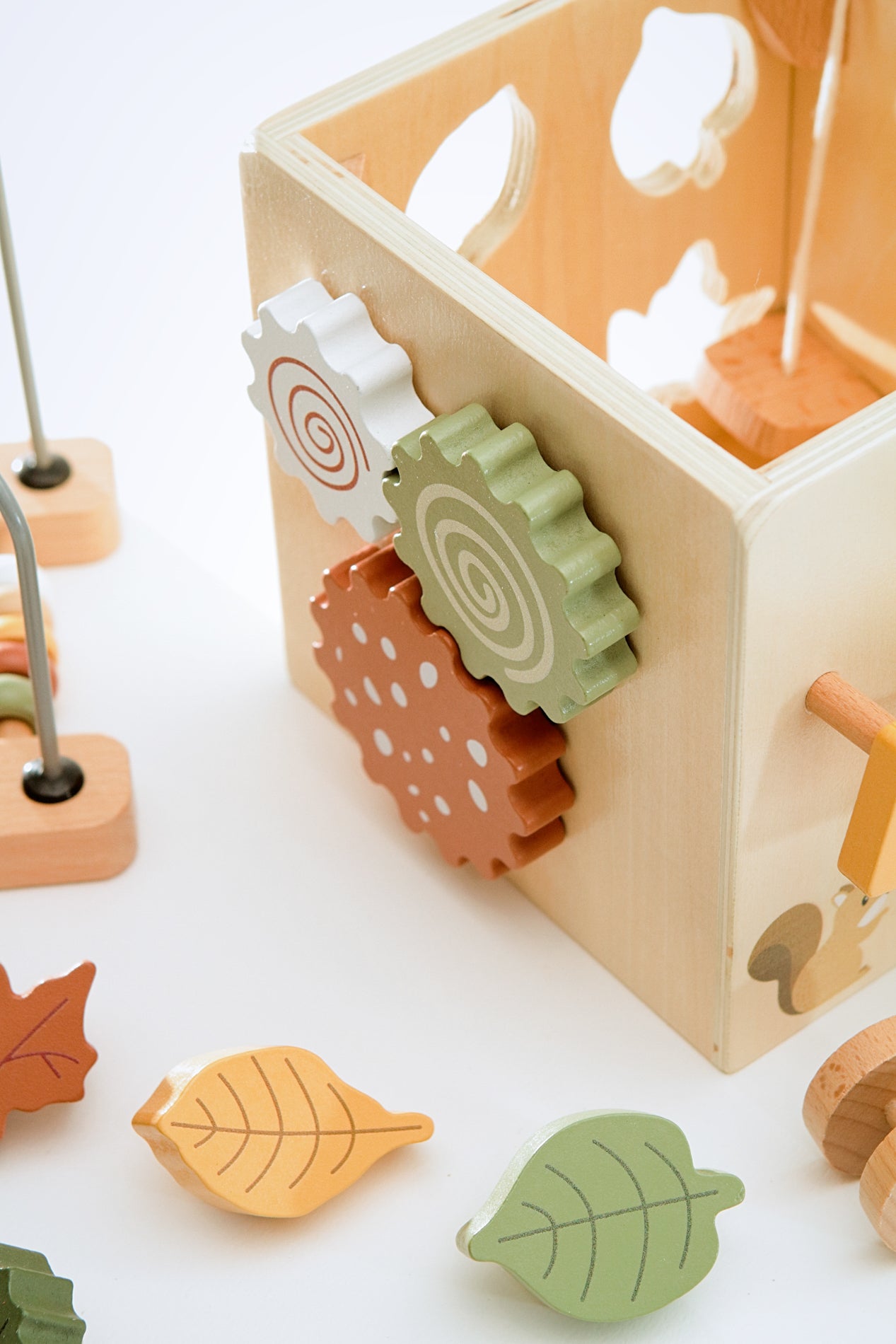Αυτός ο ξύλινος κύβος, με τις πολλές πλευρές και τα διαφορετικά παιχνίδια, θα κρατήσει το μωρό σας απασχολημένο και χαρούμενο, ενώ παράλληλα θα το βοηθήσει να αναπτύξει τις κινητικές του δεξιότητες και τη φαντασία του. Περιστρεφόμενα γρανάζια, παζλ, κρυμμένα ζωάκια, διαδρομές και μια διασκεδαστική σπείρα με χάντρες στην κορυφή.